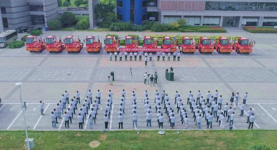 Later, Yuan Hongming presented HuangQingfeng with a golden key symbolizing “sincere cooperation and creating brilliant”. Ye Hui, executive general manager of Shanghai Zhenhua Heavy Industries Co., Ltd. International Group, announced the “Delivery Order”,and 15 terminal SHACMAN vehicle whistle to signal slowly.